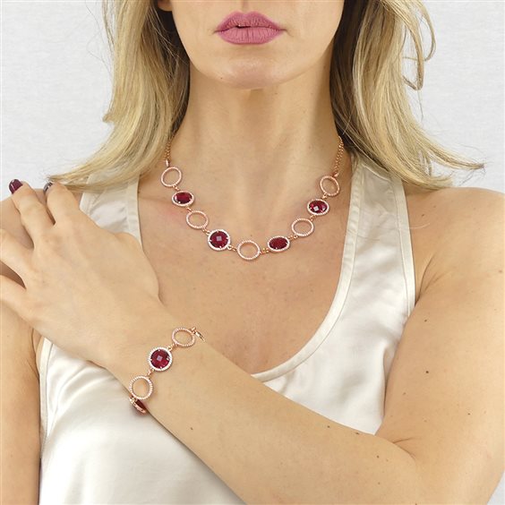 Bracciale Da Donna Di Boccadamo Della Collezione Sharada Della Linea Mediterranea. Bracciale In Bronzo Placcato Oro Rosa Con Decoro Composto Da Moduli Circolari Di Zirconi Alternati A Cristalli Briolette Color Rosso Tormalina E Zirconi. Materiale: Bronzo. Produzione: Realizzato In Italia. Misura: Cm 16,5 Estendibile Fino A Cm 20. Dimensione: Diametro Cristallo Cm 1,5. Chiusura: Con Moschettone