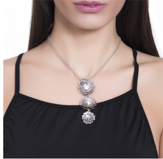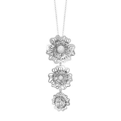 Collana con pendente a cravattino in bronzo rodiato (lunghezza cm 9), composto da rose selvatiche tridimensionali (diametro cm 3,5, 3 e 2,2), con nucleo centrale di zirconi. Duplice indosso: 1 filo cm 80 / 2 fili cm 40.