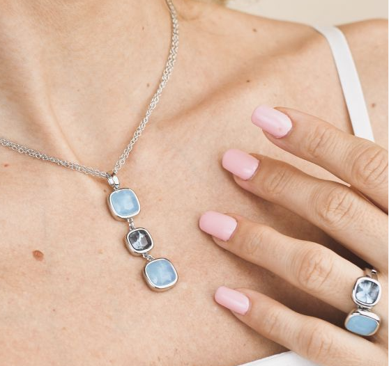 Collana bronzo rodiato con pendente di cristalli medi e piccolo azzurro lattiginoso e acquamarina. diametro cristalli cm. 1.5