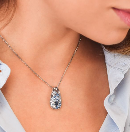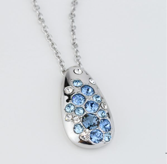Collana rodiata con pendente a forma di goccia, decorato da cristalli crystal e denim blue. Materiale: bronzo Produzione: realizzato in Italia Misure: lunghezza cm 39 estendibile fino a cm 44,5 Dimensione: pendente cm 2,5 Chiusura: con moschettone