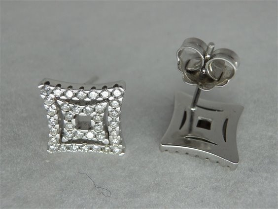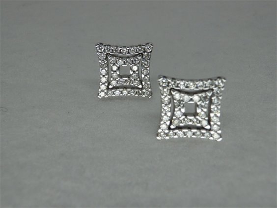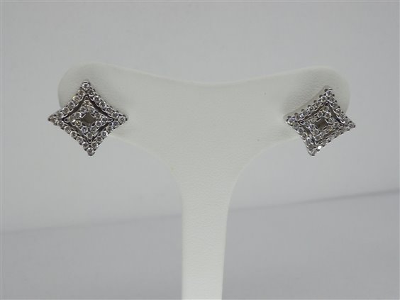 Orechini in oro bianco 750/1000 di forma romboidale con incassati diamanti taglio brillante Kt. 0,72 peso gr. 4,9. Chiusura a paletto con farfallina a pressione.