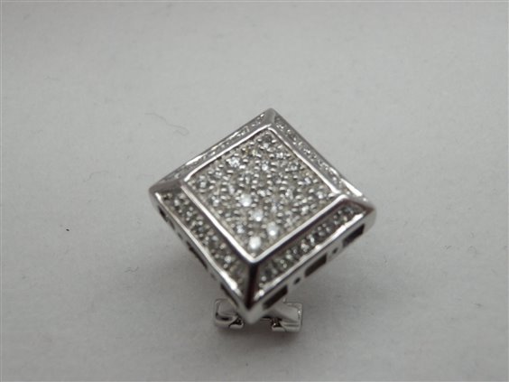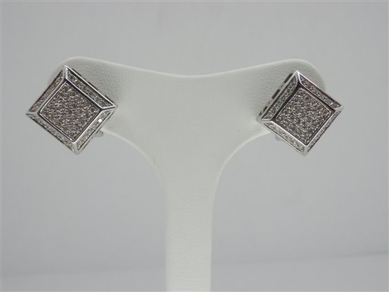 Orecchini in oro bianco 750/1000 con incastonati diamanti bianchi a pavè per Kt 0,62. La fila di diamanti di contorno inclinata sul pavè, si raccorda con galleria ad una base traforata con marchio e punzoni. Chiusura ago e clips.