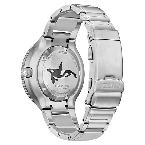 Orologio Solo Tempo Citizen Collezione Promaster Diver's Eco-Drive 200 mt. Modello Promaster Orca. Diver's Professionale Certificato ISO 6425 . Cassa in acciaio satinato con ghiera unidirezionale corona a vite. Il fondo serrato a vite riporta incisa il simbolo di questo orologio un'orca. Movimento al quarzo Eco-Drive a carica luce infinita con riserva di carica di 180 giorni. Quadrante blu, indici e lancette trattate in super lumibrite per una perfetta visione al buio. Vetro minerale leggermente bombato ad alta resistenza. Bracciale regolabile in acciaio satinato con estensione per la muta , chiusura di sicurezza deployante con pulsanti. Impermeabile 20 bar (20 atm.). Scatola (bombola) Libretto e Garanzia 5 anni Originali.