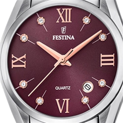 Orologio donna , acciaio 316L , movimento al quarzo M2115 , cassa mm 36 , quadrante bordeaux , datario , indici e lancette rosè , indici con zirconi bianchi , fondello a pressione , vetro minerale , cinturino regolabile lucido , chiusura con pulsanti.