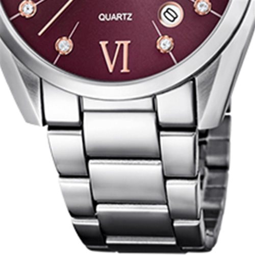 Orologio donna , acciaio 316L , movimento al quarzo M2115 , cassa mm 36 , quadrante bordeaux , datario , indici e lancette rosè , indici con zirconi bianchi , fondello a pressione , vetro minerale , cinturino regolabile lucido , chiusura con pulsanti.