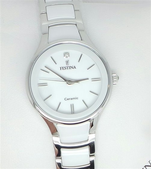 Orologio solo tempo donna ceramica, 30mm diametro con cassa in acciaio di forma rotonda, quadrante bianco con indici e zircone incastonato a ore 12. Orologio W.R 50 metri Con bracciale in ceramica bianca e acciaio, chiusura con doppio pulsante.Elegante in versione small.