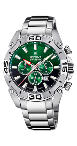 Festina Chronobike 45mm da uomo,cronografo al quarzo. Quadrante verde-nero, datario tra le ore 4 e 5. Fondello a vite, impermeabile fino a 10atm. Bracciale in acciaio con chiusura deployante dotata di pulsanti di sicurezza.