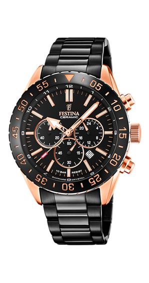 Orologio Festina Ceramica cronografo al quarzo da uomo. Diametro 44mm, spessore 13mm, Peso 160gr. Vetro zaffiro, quadrante nero , cassa acciaio PVD oro rosa con lunetta ceramica nera 10atm, bracciale acciaio nero.