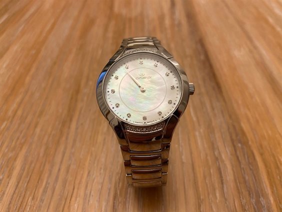 OROLOGIO LORENZ CON CASSA E BRACCIALE IN ACCIAIO ,CHIUSURA DEPLOYANTE A SCOMPARSA, MOVIMENTO AL QUARZO SWISS MADE, QUADRANTE IN MADREPERLA NATURALE CON 12 DIAMANTI SULLE ORE , GHIERA CON 18 DIAMANTI .WR 3 ATM .GARANZIA 3 ANNI