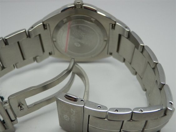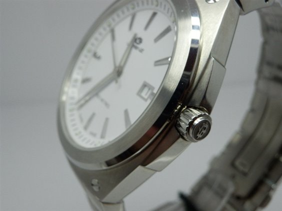 Orologio in acciaio con quadrante bianco con indici applicati. Vetro zaffiro. Corona e fondello serrati a vite. Chiusura deployante a pulanti.