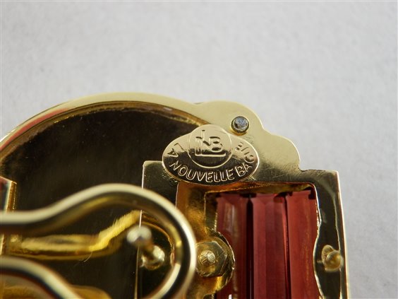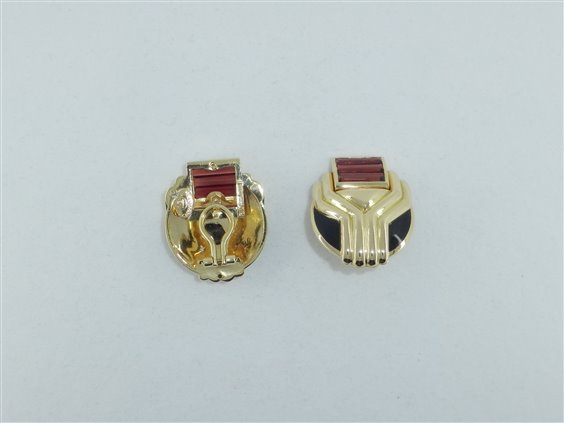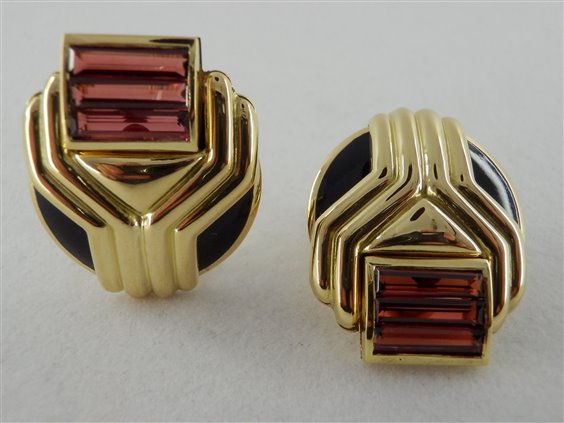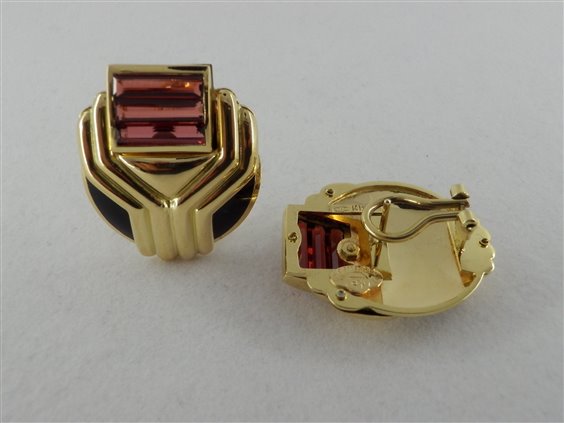 Orecchini in oro 750/1000 con smalto nero a fuoco e baguette di granato. Chiusura ago e clips. Dim. cm 2,5x3,1 - peso g. 19,8
