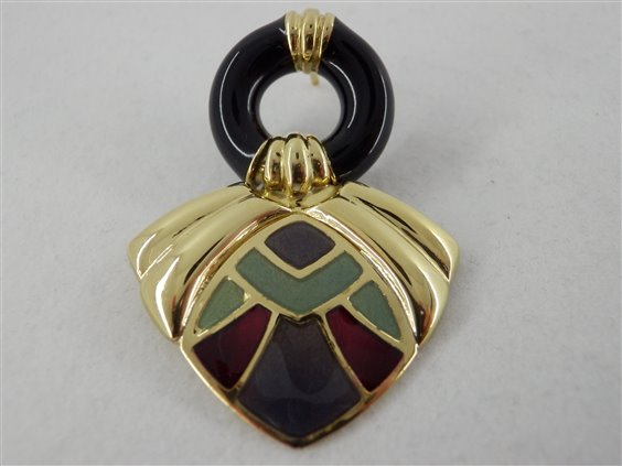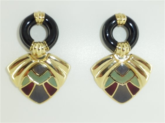 Orecchini in oro 750/100 con smalti policromi. Nella parte superiore lo smalto è su argento mentre nel ventaglio inferiore è direttamente su oro. Chiusura con farfallina all'americana. Dim. 4,5x3,1 cm - peso g. 17,4