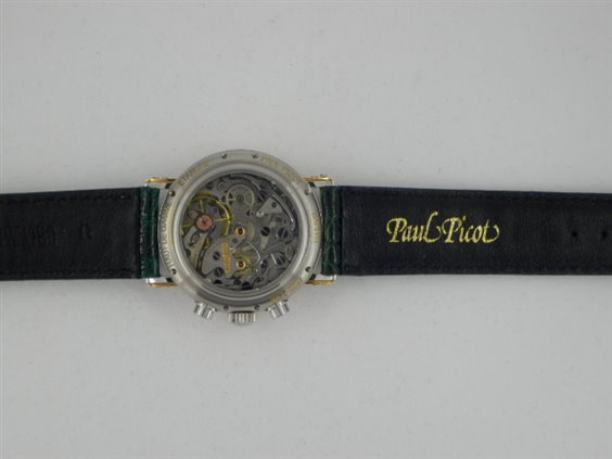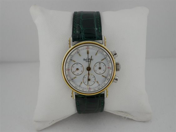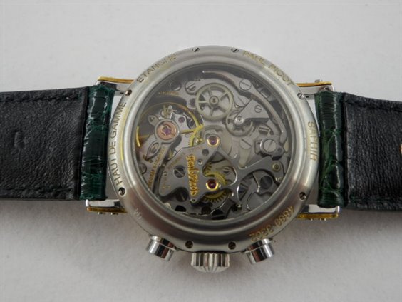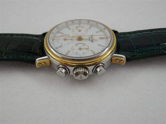 Orologio cronografo, monta movimento Lemania calibro 1874 meccanico a carica manuale. Movimento 17 rubini, 21.600 alternanze, interamente rifinito a mano con autonomia di 50 ore e bene in vista attraverso il fondello trasparente in vetro zaffiro. Cassa in acciaio e oro che ne definisce i contorni sia sulla lunetta che sulle doppie anse avvitate Lunetta con lavorazione a gradini, vetro zaffiro bombato, quadrante in smalto bianco con 3 contatori con scala sessantesimale e indicazione dei mezzi secondi sul perimetro e tachimetrica sul rehaut, indici a bastone applicati. Cinturino originale in coccodrillo verde con fibbia personalizzata, chiusura ad ardiglione.