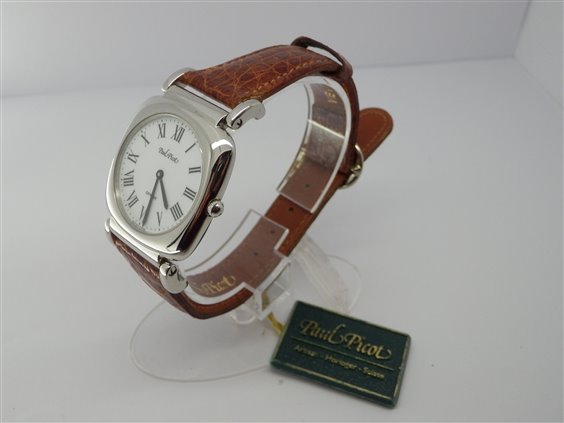 Orologio funzioni ore e minuti. Vetro zaffiro, fondello serrato a pressione. Cinturino in coccodrillo con anse snodare e chiusura ad ardiglione.