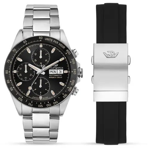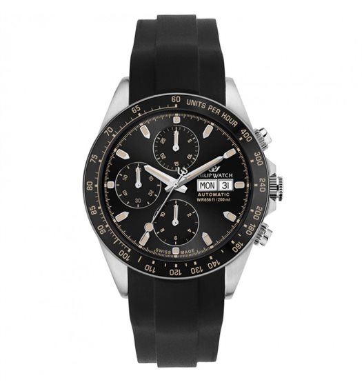 Cronografo automatico con movimento SELLITA SW500 Vetro zaffiro curvato Fondello e corona a vite Quadrante nero Ghiera nera con inserto in ceramica Bracciale e cinturino in silicone con estensione muta