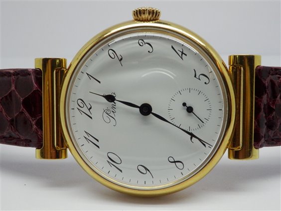 Orologio con cassa in acciaio placcato oro giallo con anse articolate. Movimento meccanico a carica manuale, scheletrato e decorato con incisioni, visibile dal fondello chiuso a pressione. Quadrante bianco con piccoli secondi ad ore 6. Corona placcata oro giallo con logo.