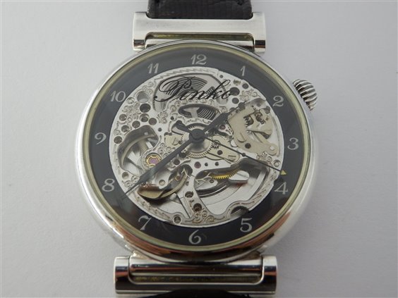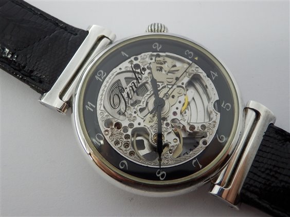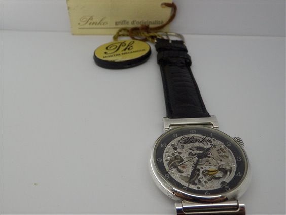 Orologio distribuito da HEBDOMAS e PINKO in argento con anse articolate sulla cassa. Movimento A. SHILD automatico scheletrato e decorato. Vetro in plexiglass e fondello con vetro minerale. I numeri romani sono inseriti su un disco nero. La corona ad ore 2. L'orologio monta un cinturino in lucertola non originale .