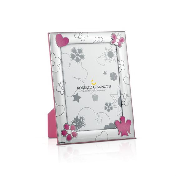 Cornice in argento bilaminato con angelo, cuore, fiore e farfalla smaltati in rosa. Grande: portafoto interno: base 13 cm - altezza 18 cm, cornice: base 17,2 cm - altezza 22,5 cm