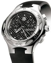 Orologio cronografo al quarzo Ti5, quadrante nero, datario ad ore 4. Funzioni cronometraggio semplice ed addizionale, misurazione dei tempi intermedi e di due tempi ravvicinati, visualizzazione al 1/10 di secondo, contatori dei secondi e delle 12 ore su piccoli quadranti decentrati. Cassa in lega di titanio, finitura lucida. Quadrante in fibra di carbonio, indici luminosi, lancette nichelate dalla forma a lama, vetro zaffiro inscalfibile bombato. Ghiera girevole unidirezionale, in lega di titanio lucido con scanalature ed indicazioni per le immersioni. Corona e fondello serrati a vite assicurano un'impermeabilità fino a 200 metri. Cinturino in caucciù vulcanizzato perfettamente integrato nella cassa, garantisce una resistenza eccezionale, chiusura pieghevole in titanio grado 5. Curiosità: Il titanio grado 5 (Ti5) è una lega di titanio (90%), alluminio (6%) e vanadio (4%). Il titanio grado 5 è due volte più leggero e resistente dell'acciaio, non contiene nickel e quindi è antiallergico. Tag Heuer è la prima azienda orologiera ad aver lucidato completamente un orologio composto da questa lega di titanio.