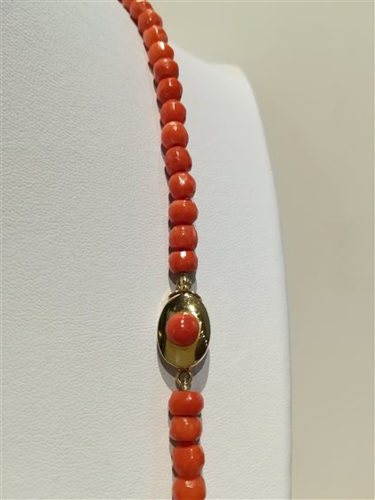 Collana corallo a botticella sfaccettato a scalare, chiusura in oro giallo 750/00 e corallo.