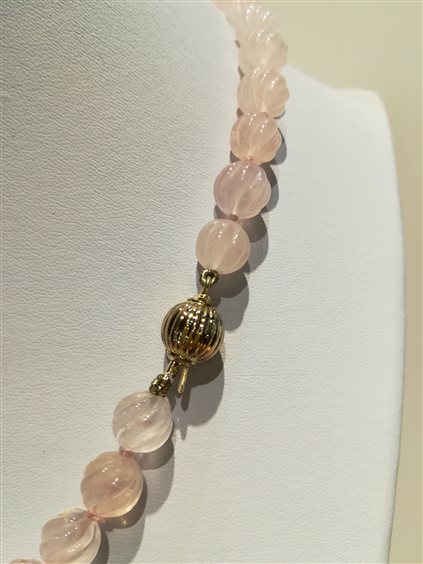 Collana in quarzo rosa lavorato e chiusura in argento dorato.