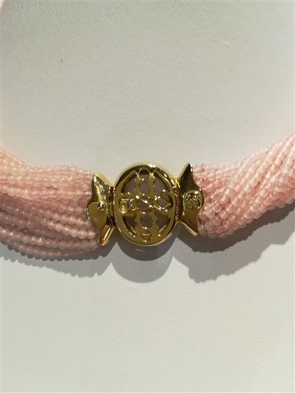 Collana torchon in quarzo rosa a 23 fili con chiusura in oro giallo 750/00 e quarzo rosa satinato e zaffiri cabochon con otto di sicura.