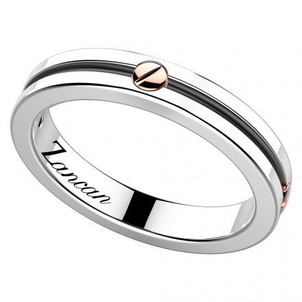 Anello da uomo in argento con vite in oro rosa e riga in rodiatura nera.