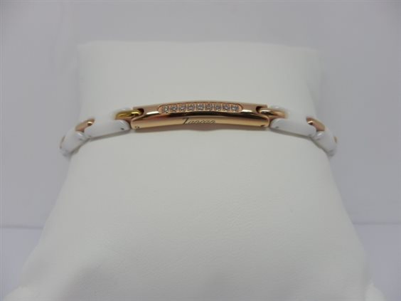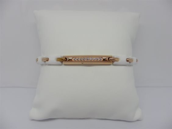 Bracciale in ceramica bianca con piastra in acciaio 316L PVD oro rosa e zirconi