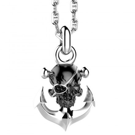 Collana in argento con lavorazione a rolò e pendente con ancora e teschio. Chiusura a moschettone con la stella della rosa dei venti. Il teschio indossa un copri occhio con pietre nere, il giusto accessorio per un tipo come te che adora viaggiare libero sentendosi sempre a proprio agio.
